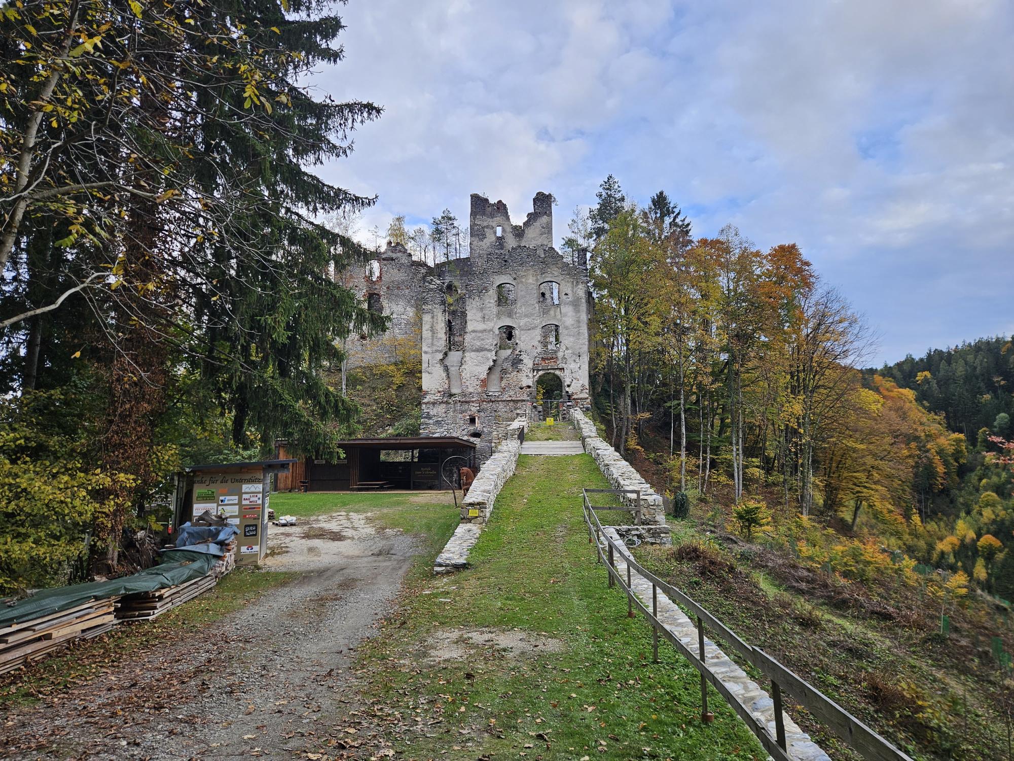 Im Zuge dieser Maßnahmen wurden auch alle Risse und Fugen der vorderen Burgmauer von unseren Vereinsmitgliedern mithilfe eines 38 Meter hohen Steigers sorgfältig ausgebessert und verfugt.