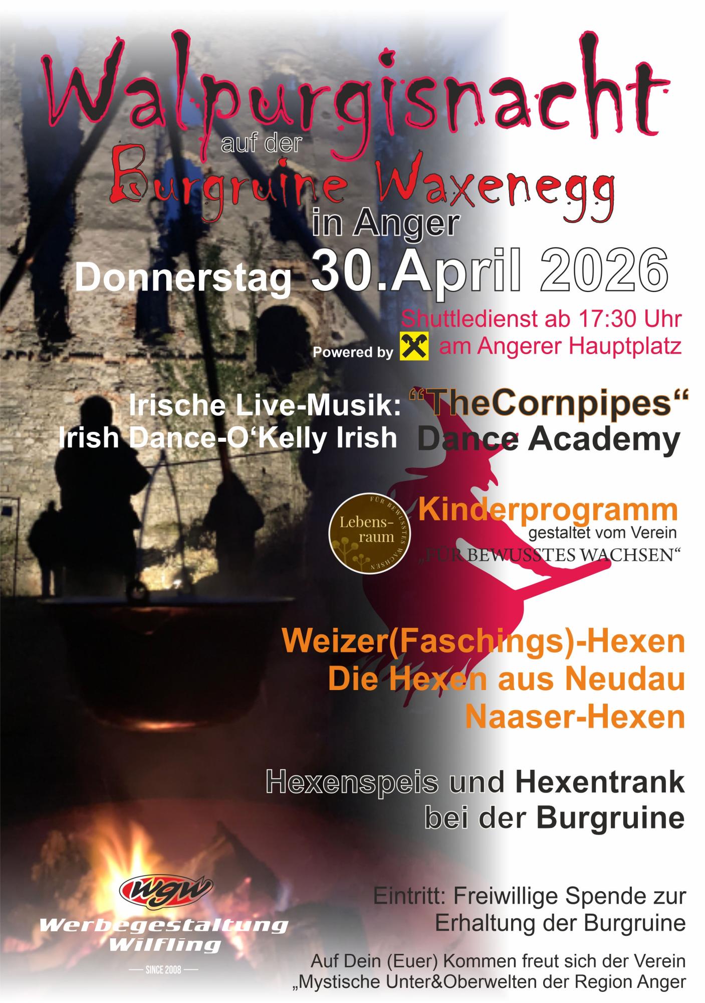 Der Verein „Der mystischen Unter- und Oberwelten der Region Anger“ lädt am 30. April 2026 ab 17. 30 Uhr wieder zur Walpurgisnacht auf die Burgruine Waxenegg ein. Im Schein des Feuers und der mystischen Beleuchtung der Ruine werden die Weizer Hexen, die Hexen aus Neudau sowie die Naaser Hexen ihre energiegeladenen und tänzerisch anmutigen Darbietungen präsentieren.